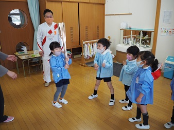 飯田市内で行われた聖火リレーのランナーとして走られた安藤さん(長姫チャイルドキャンプ 安藤民平さん)が、子どもたちに見せに来てくださり、年長・年中児が実際に持たせていただきました。