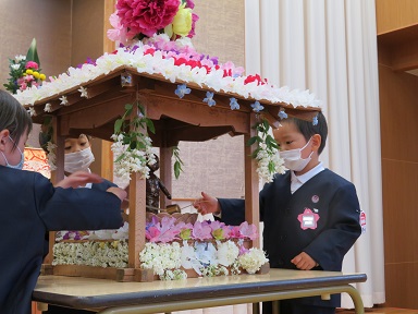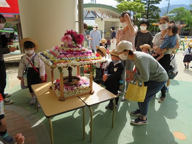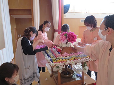 朝、先生たちがお花御堂を花で飾りました。