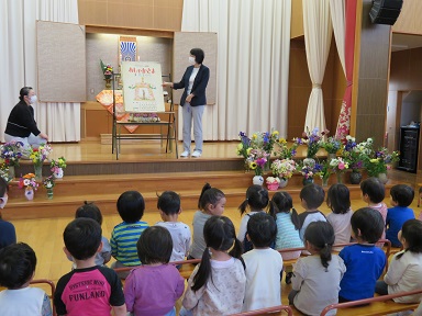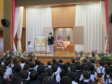 園長先生より大きな絵図を使ってお釈迦様のお誕生のお話をお聞きしました。