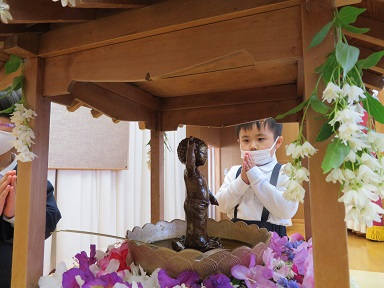 お釈迦様がお生まれになった時には空から甘露の雨が降り注いだことにちなみ、小さなお釈迦様の像に甘茶をそっとかけます。
