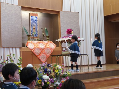お家から持ってきて頂いたお花がステージに飾られています。ありがとうございました。