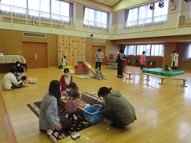 あいにくのお天気で、予定していた園庭でのお遊びはできませんでしたが、遊戯室で思う存分遊びました。