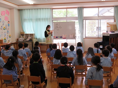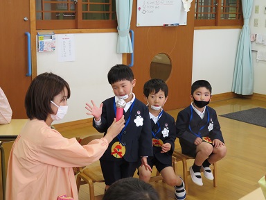 年長さんは保護者の方に書いて頂いた名前の由来についての話を先生から聞いています。