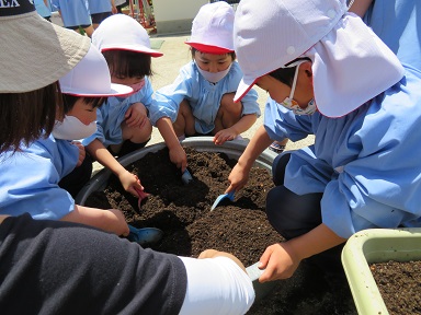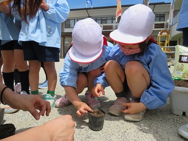 今回は、あさがお・ひまわり・ポップコーンを植えました。小さな種がどんな風に大きく生長していくか楽しみです。