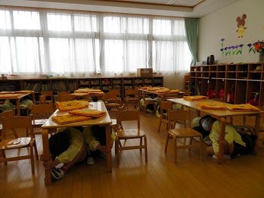 机の下に入って机の脚を握りダンゴムシのポーズをして身を守ります。