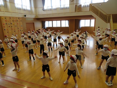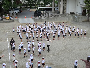 雨の日は室内で、晴れた日には園庭で体操をしています。