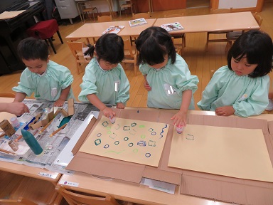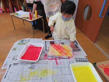 こいのぼりも作っています。段ボールを丸めたものや空き容器でペタペタとスタンプを楽しむ年少さん