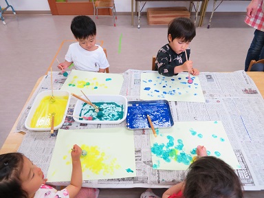 たんぽでペタペタとスタンプを楽しむ2歳児さん。