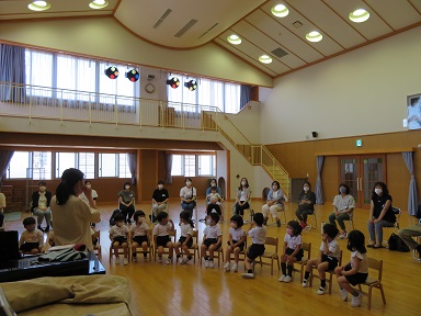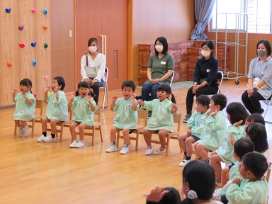年少 さくら組 ふじ組です。朝のお集まりをしています。