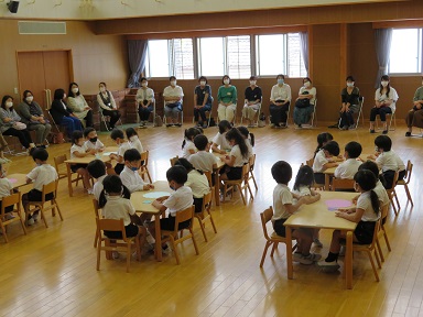 31日~ 3歳以上児は1クラスずつ遊戯室での参観・クラス役員決め、未満児は保育参加・園長講話が行われています。