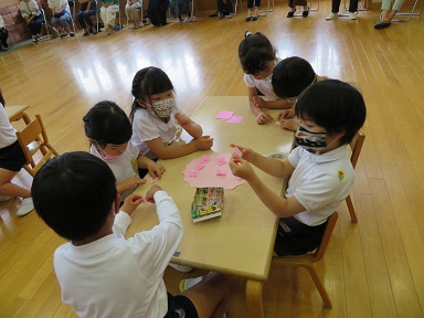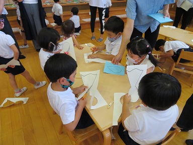 年中 うめ組となでしこ組は、お集まりの後にハサミを使った制作を行いました。曲線も上手に切れるようになってきています。