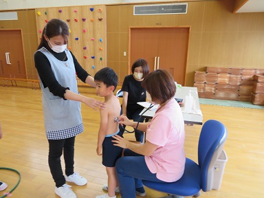 佐野先生にお越しいただき、全園児内科検診を行いました。年少さんはお医者さんごっこをしてから検診を受けたみたいですよ。