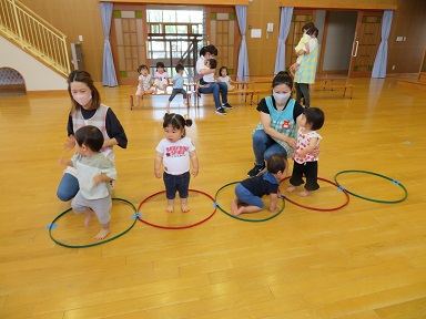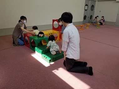 その後プール室で遊びました。ハイハイや伝い歩きを思い切りできました。(7日)