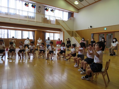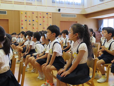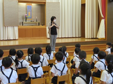 年長児は遊戯室で園長先生のお話をお聞きしました。