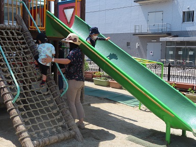 ブランコや大型滑り台などに挑戦したり、サッカーをお母さんと楽しんだり、砂場で砂を好きなように使って遊んだり・・・。