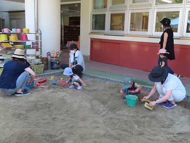 暑かったせいか、途中から裸足で遊ぶ友達も多く、じょうろを出すと、水を何度も汲んできては砂場に流し込んで遊んでいました。7月になったら、泥遊びもしましょうね!
