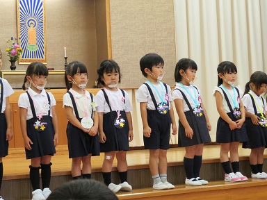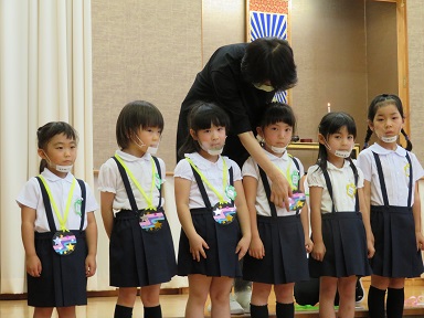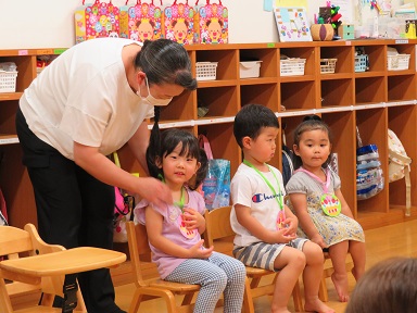 未満児さんの7月生まれのお友だちは2歳児のお友だち3人です。 髙松先生にペンダントをかけてもらいます。