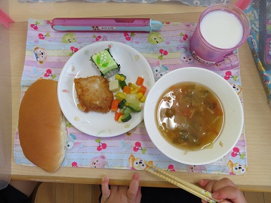 今日の給食は、コッペパン・マグロのバーベキュー風・コロコロサラダ・トマトスープ・プチケーキ(0.1歳児はオレンジ)・牛乳 でした。