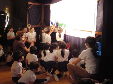 年長さんが「はらぺこあおむし」の影絵を見せてくれました。あおむしや果物は年長2クラス合同で制作してきました。