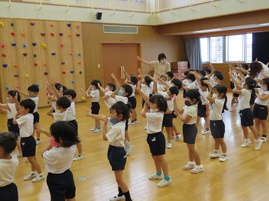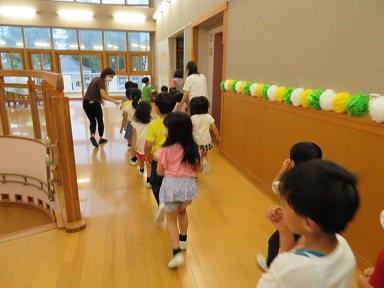 年中さんは、花火大会で踊る「ほたる」をしています。昨日の予定でしたが雨天順延になりました。今日は出来るといいですね!