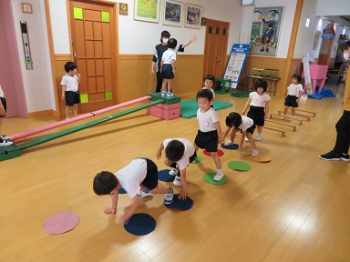 雨の日、年少さんはフリースペースで橋を渡ったり、ジャンプしたり、四つん這いになったり、、全身を動かして遊んでいました。
