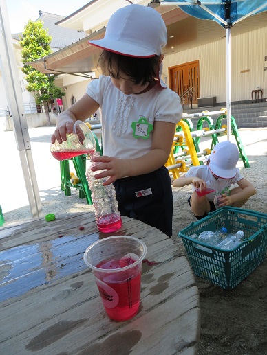 年長さんはいろんな色の色水を作っていました。
