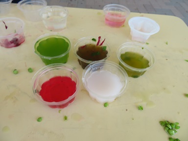 緑は葉っぱの色水、白いのは、、なんでしょう? ヒントは、花の名前 オシロイバナです。