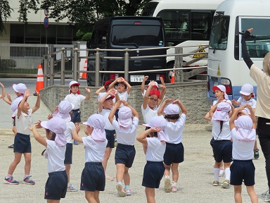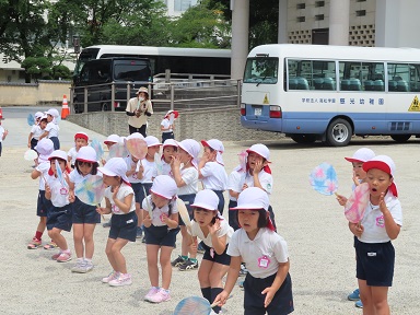 先程、花火大会を楽しみに、年中さんが園庭で「ほたるこい」と「竜峡小唄」を踊っていました。素敵な和紙染めのうちわができましたね!お家の方に見ていただくのが楽しみです。