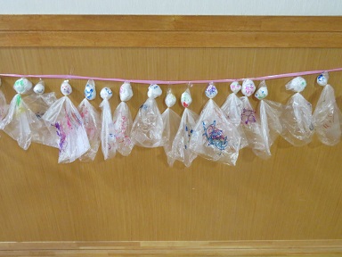 花火大会が晴れますように!と、年中さんはてるてる坊主を作って1階フリースペースに飾っていました。