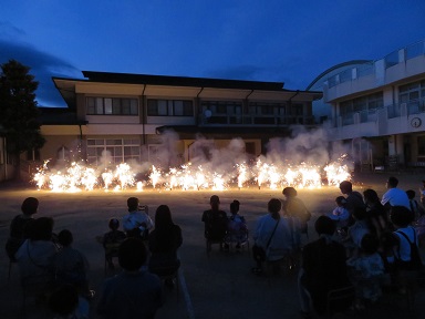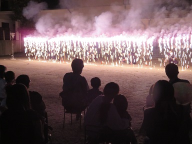 お父さんたちが噴出花火や大きな手持ち花火に火をつけて見せてくれました。花火で園庭が明るくなりました。