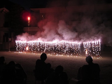 花火の後ろで次の花火に点火するお父さん方が準備をしてくれています。そして、ナイヤガラと打ち上げ花火の共演!