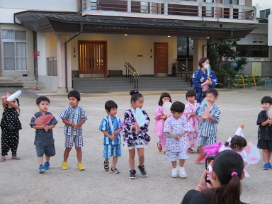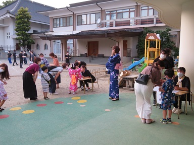 受付でうちわをもらいます。夕方、しかも普段と違う服装で園に来た子どもたちはウキウキしていました。