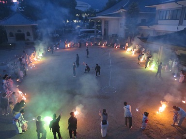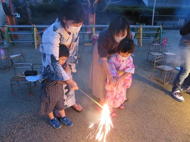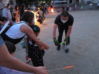 今年は手持ち花火もできました。年中の父親委員やボランティアのお父さん方が火をつけて下さいます。