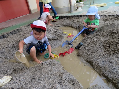 未満児のお友だちは砂場に水を流して川を作ったり、玩具の船を浮かべて遊んでいます。