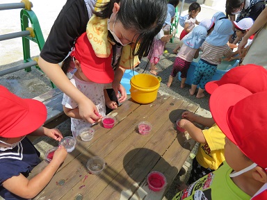 ちゅーりっぷさんは先生と庭のオシロイバナで色水を作っています。きれいな赤い色が出ていますね。