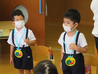 3歳以上児は園長先生が各保育室を回ってペンダントをかけて下さったり、お誕生日の歌を歌ったりしました。