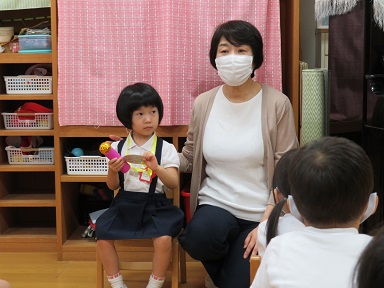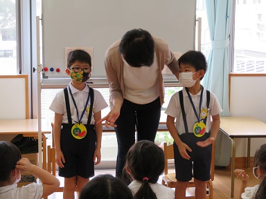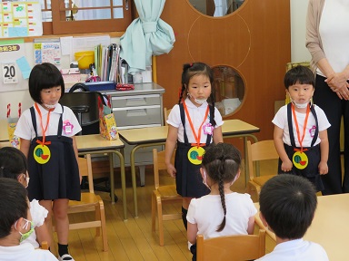 年長さんは、3人です。園長先生からどんなペンダントかのスリーヒントクイズを出してもらいました。