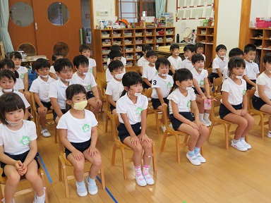 園長先生からのお話を放送で聞いています。2学期は8月から12月までの長い学期であること、その中にはいろんな行事があり、皆で力を合わせてやることが多くなることやコロナウイルスの対策をしましょうなどのお話がありました。