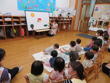 たんぽぽさんとつくしさんの誕生者はいませんでしたが、皆でパネルシアター「かわいいかくれんぼ」を見ました。