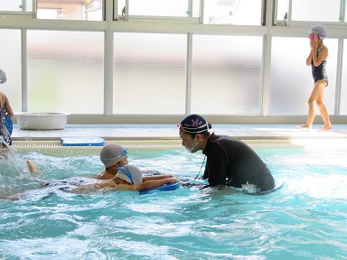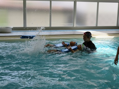 「らっこさん」にも挑戦しました。先生に支えてもらってビート板を抱えれば、上向きで浮く感覚も楽しめました。