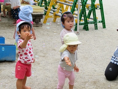 「シャボン玉、きれいだな」触ろうとしてみますが風に吹かれて飛んでいってしまいます。