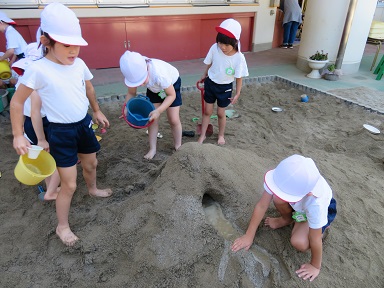 年長さんは、砂山にトンネルが通って水を流しています。「こっちから流していい?」「いいよ」と声をかけながら流す声が聞こえました。