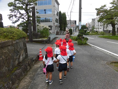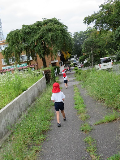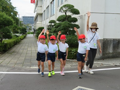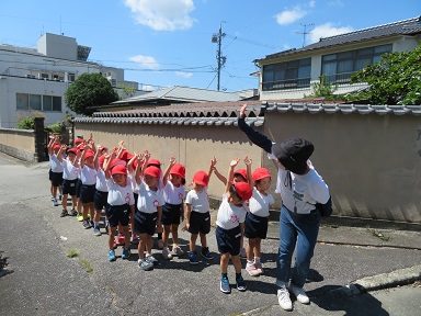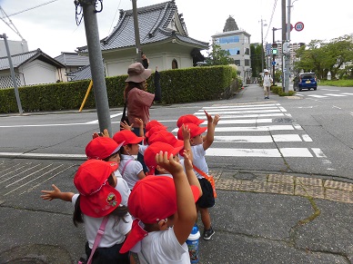 園外保育を経験している年長さんは皆で歩くのも上手になってきています。今回は数人毎に歩道を渡ったり一人ずつ歩いてみました。