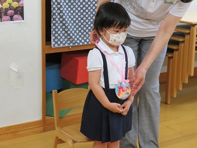 園長先生から「赤とんぼ」のペンダントをかけて頂きました。