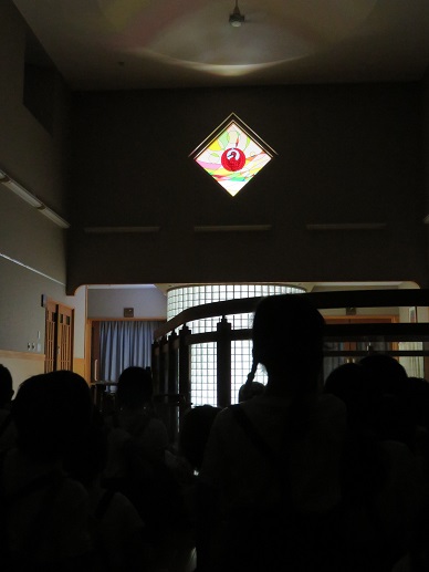 二階フリースペースを暗くしてホール吹き抜けの電気を付けると、、、ステンドグラスの中に園章が浮かび上がりました。