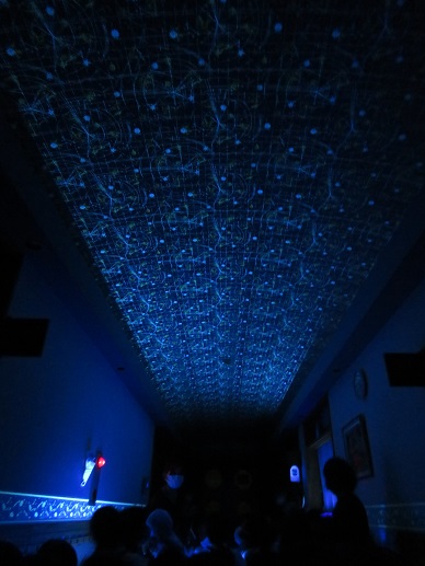 二階保育室前を暗くし、ブラックライトを付けると、、、天井に星空が浮かび上がりました。