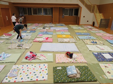 間隔をあけて布団を敷きましたので、遊戯室は布団でいっぱいです。