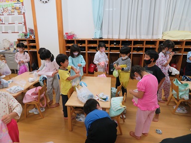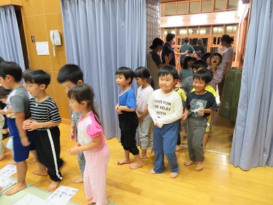 着替えを終えて移動します。嬉しそうな顔をして遊戯室に入ってくる子どもたちでした。
