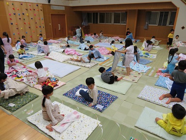 自分の布団に入ります。遊戯室では子どもたち58人と担任2人の60人で寝ます。涼しく眠れそうです。
