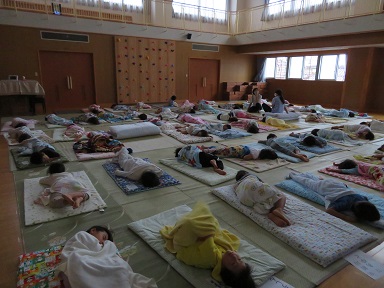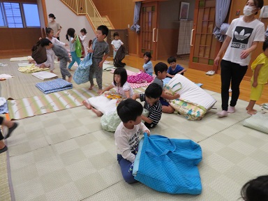 先生が「おはようございます」と電気を付けました。元気に起きられました。自分の布団をたたみます。